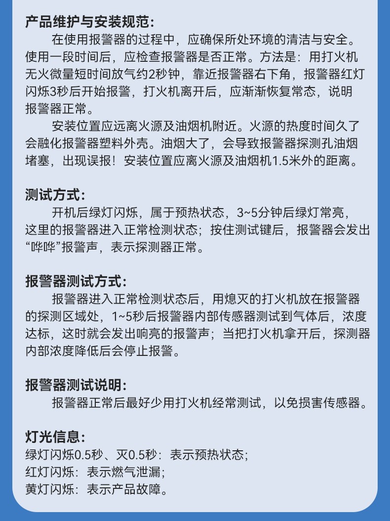 燃氣報警器 (型號PA-816) 產品規格 功能特點 資料下載 燃氣報警器 (型號PA-816)報警方式:高音報警、聲光報警工作電源:外接 電源AC220V故障自檢:泄露報警、正常工作、故障提醒多種氣體檢測平安保險85分貝高音量報警適用場景:適用于家庭廚房、酒店廚房、食堂、商場等場所