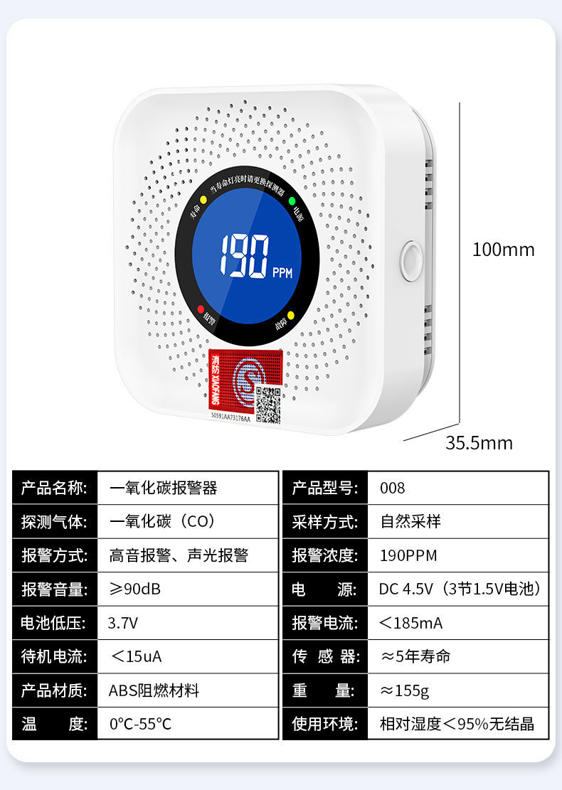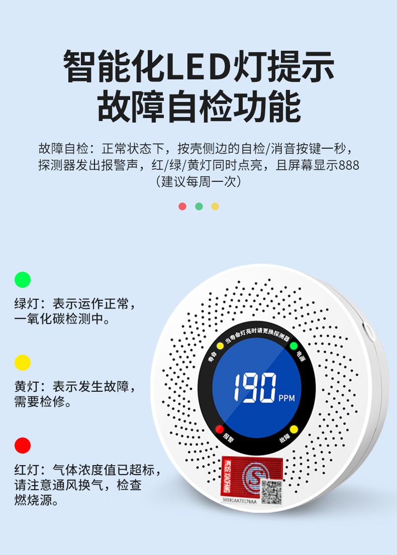 一氧化碳報警器(型號PA-007) 產品規格 功能特點 資料下載 一氧化碳報警器(型號PA-007)1.探測氣體:一氧化碳2.報警方式:高音報警、聲光報警3.材質:ABS阻燃材質4.產品保險:1000萬承險適用場景:適用于廚房、浴室、起居室、火鍋包廂、飯堂等長時間空氣不流通的場所安裝一氧化碳報警探測器