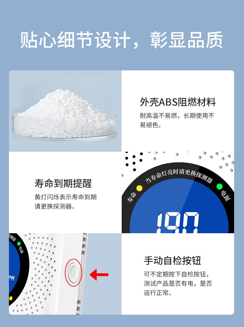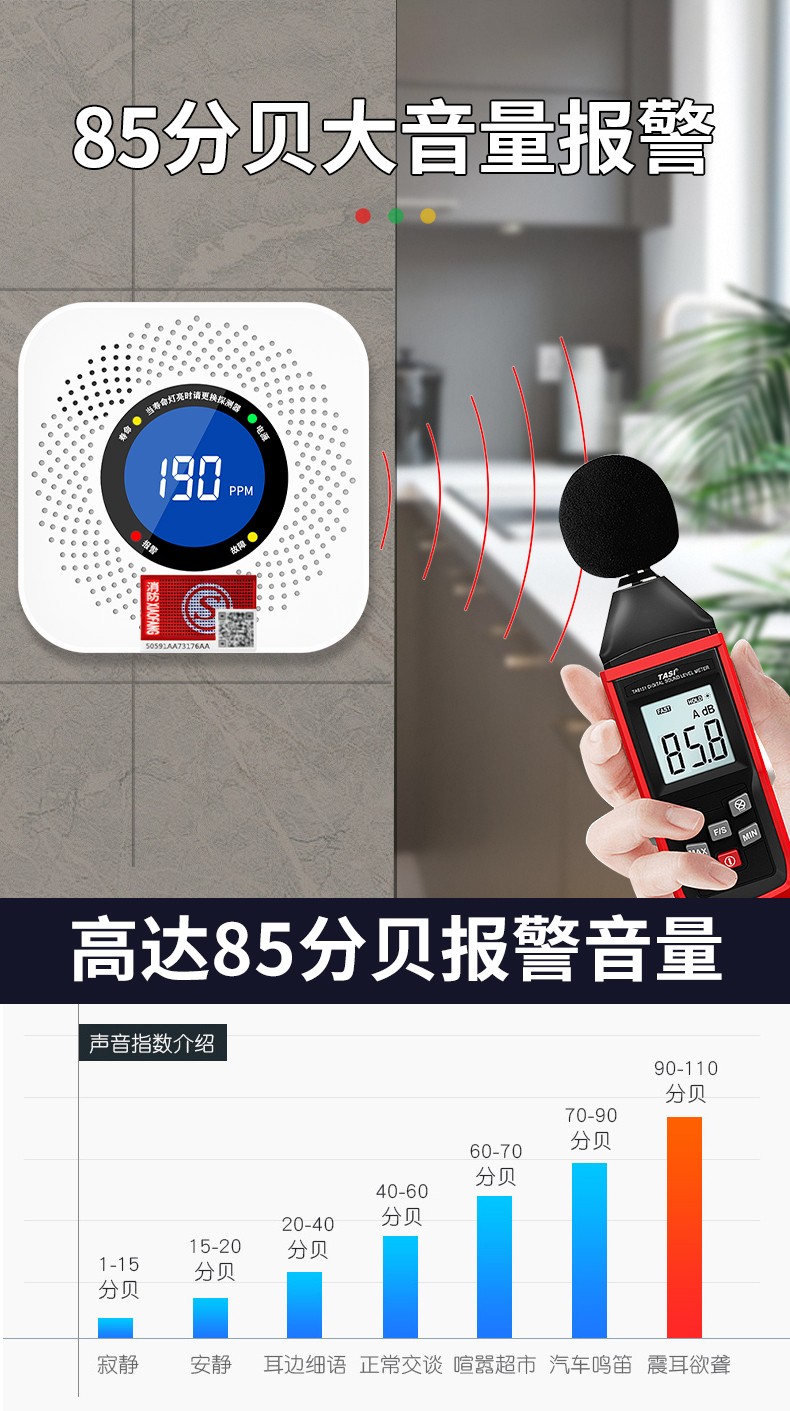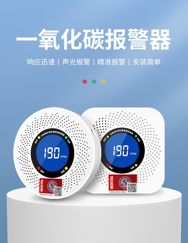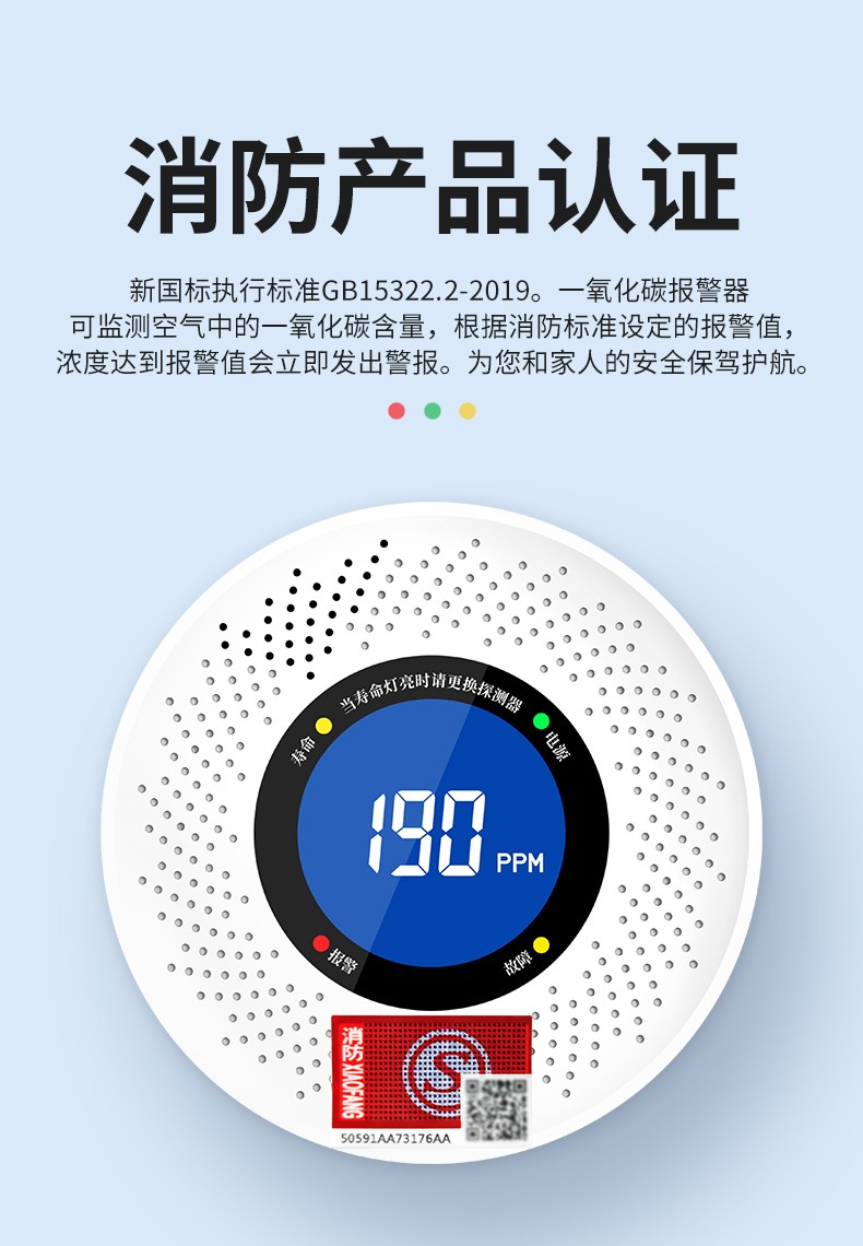 一氧化碳報警器(型號PA-008) 產(chǎn)品規(guī)格 功能特點 資料下載 一氧化碳報警器(型號PA-008)檢測氣體、燒煤、燒柴、燒炭、蜂窩媒、露營封閉環(huán)境、封閉車內(nèi)85分貝報警音量.LED液晶屏幕顯示故障自檢: 綠燈(正常)、黃燈 (故障、需要檢修) 紅燈(氣體濃度超標(biāo)) 5.報警方式:蜂鳴聲提示 6. 產(chǎn)品保險:1000萬承險 7. ABS阻燃材質(zhì)適用場景:適用于廚房、浴室、起居室、火鍋包廂、飯?zhí)玫乳L時間空氣不流通的場所安裝一氧化碳報警探測器