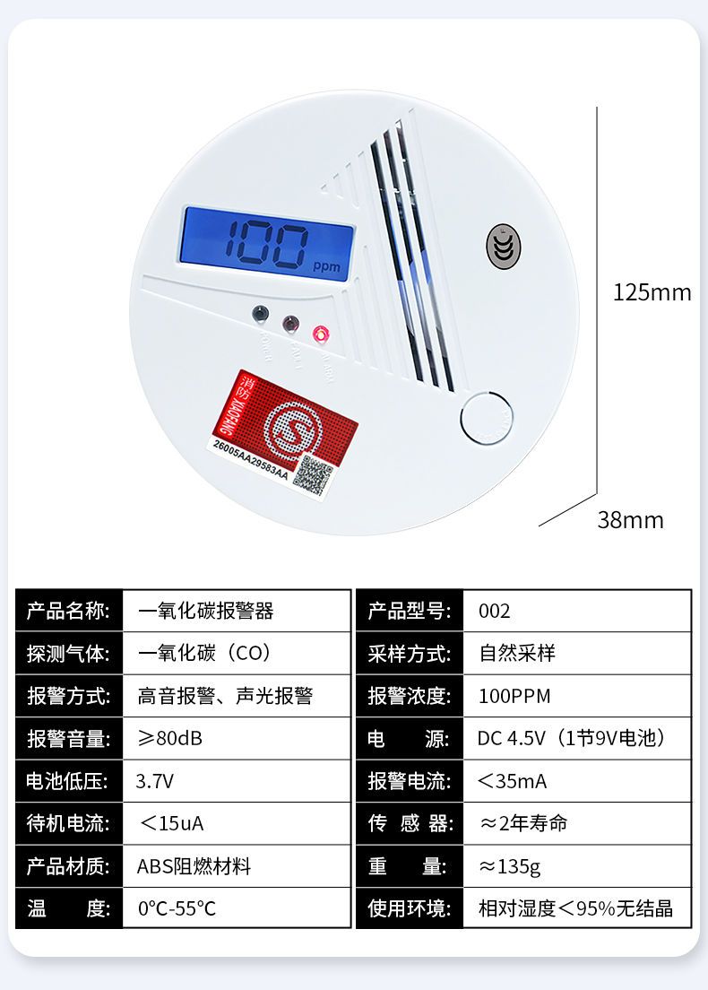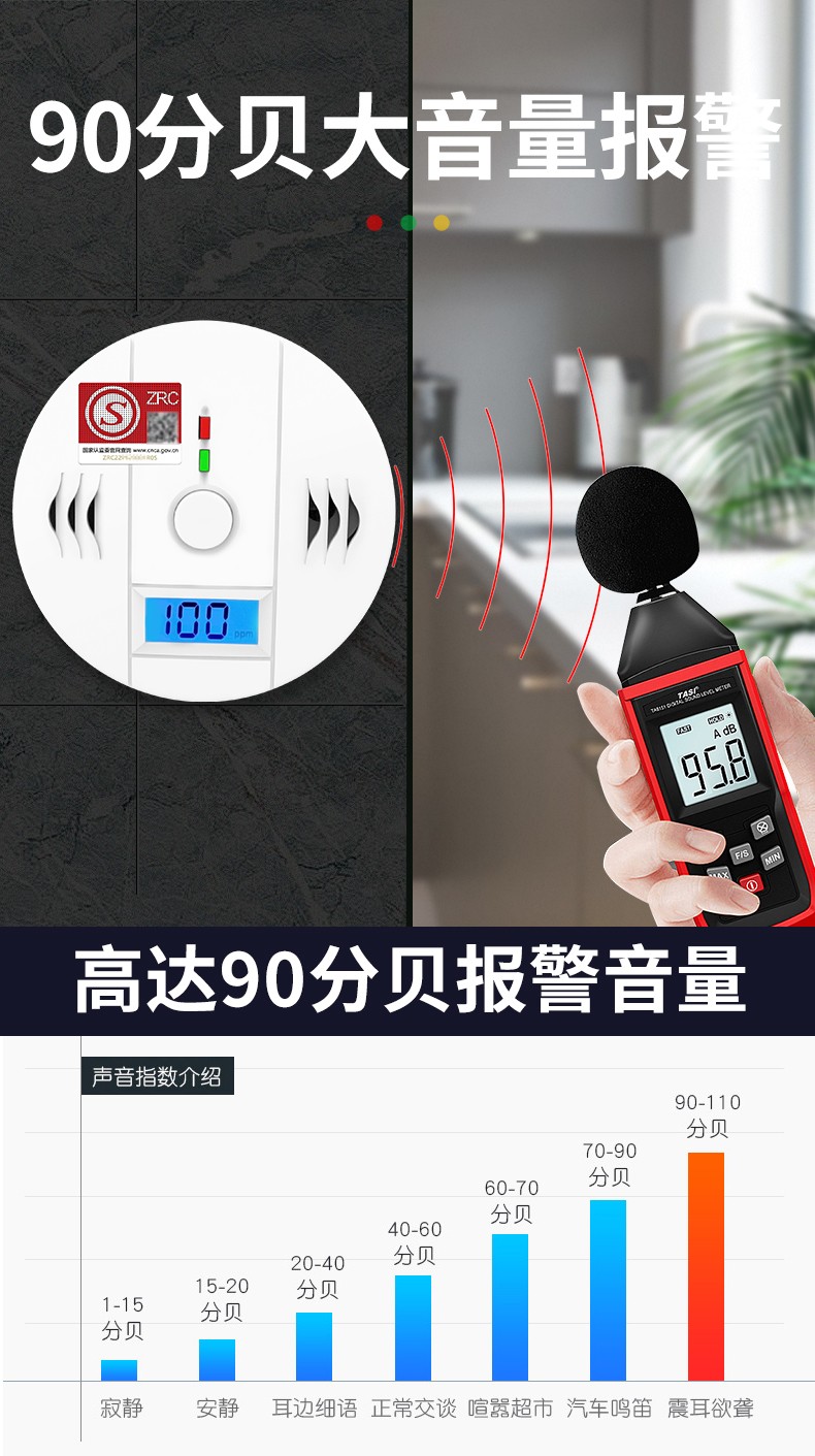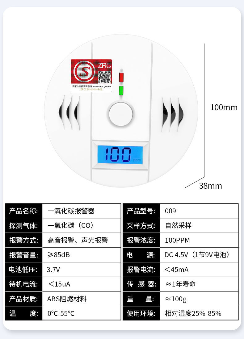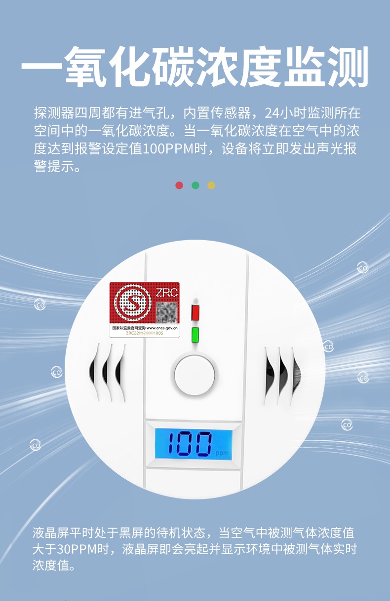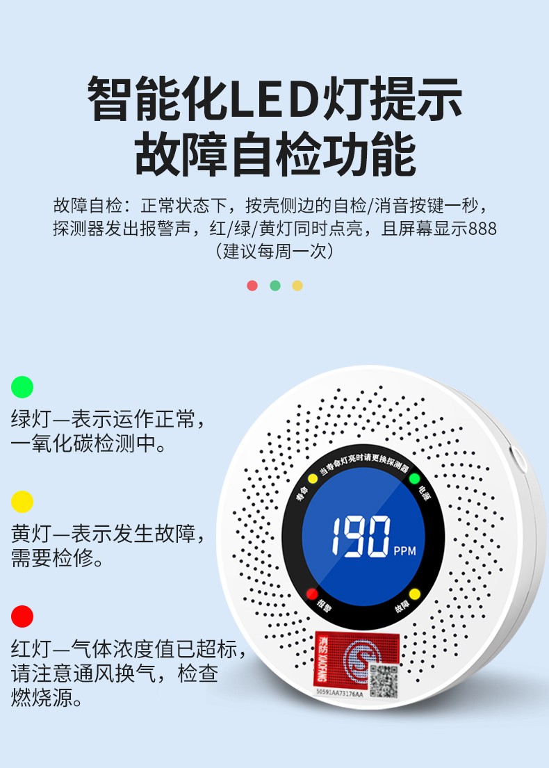一氧化碳報警器(型號PA-009) 產(chǎn)品規(guī)格 功能特點(diǎn) 資料下載 一氧化碳報警器(型號PA-009)1.檢測氣體、燒煤、燒柴、燒炭、蜂窩媒、露營封閉環(huán)境、封閉車內(nèi)2.85分貝報警音量3..LED液晶屏幕顯示4.故障自檢: 綠燈(正常)、黃燈 (故障、需要檢修) 紅燈(氣體濃度超標(biāo))5.報警方式:蜂鳴聲提示 6. 產(chǎn)品保險:1000萬承險7. ABS阻燃材質(zhì)適用場景:適用于廚房、浴室、起居室、火鍋包廂、飯?zhí)玫乳L時間空氣不流通的場所安裝一氧化碳報警探測器
