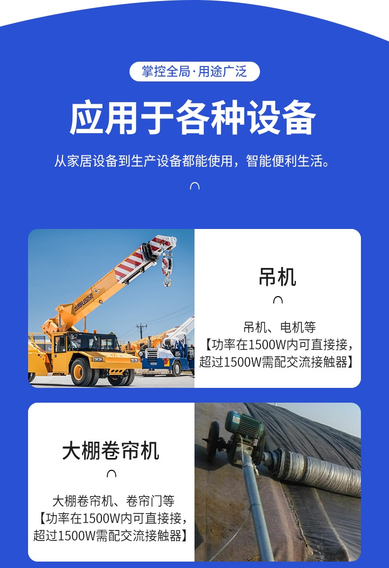 應(yīng)用場(chǎng)景:起吊設(shè)備 ,大鵬卷簾機(jī)、升降設(shè)備、正反轉(zhuǎn)電機(jī),工業(yè)信號(hào)控制, 投影幕布等
