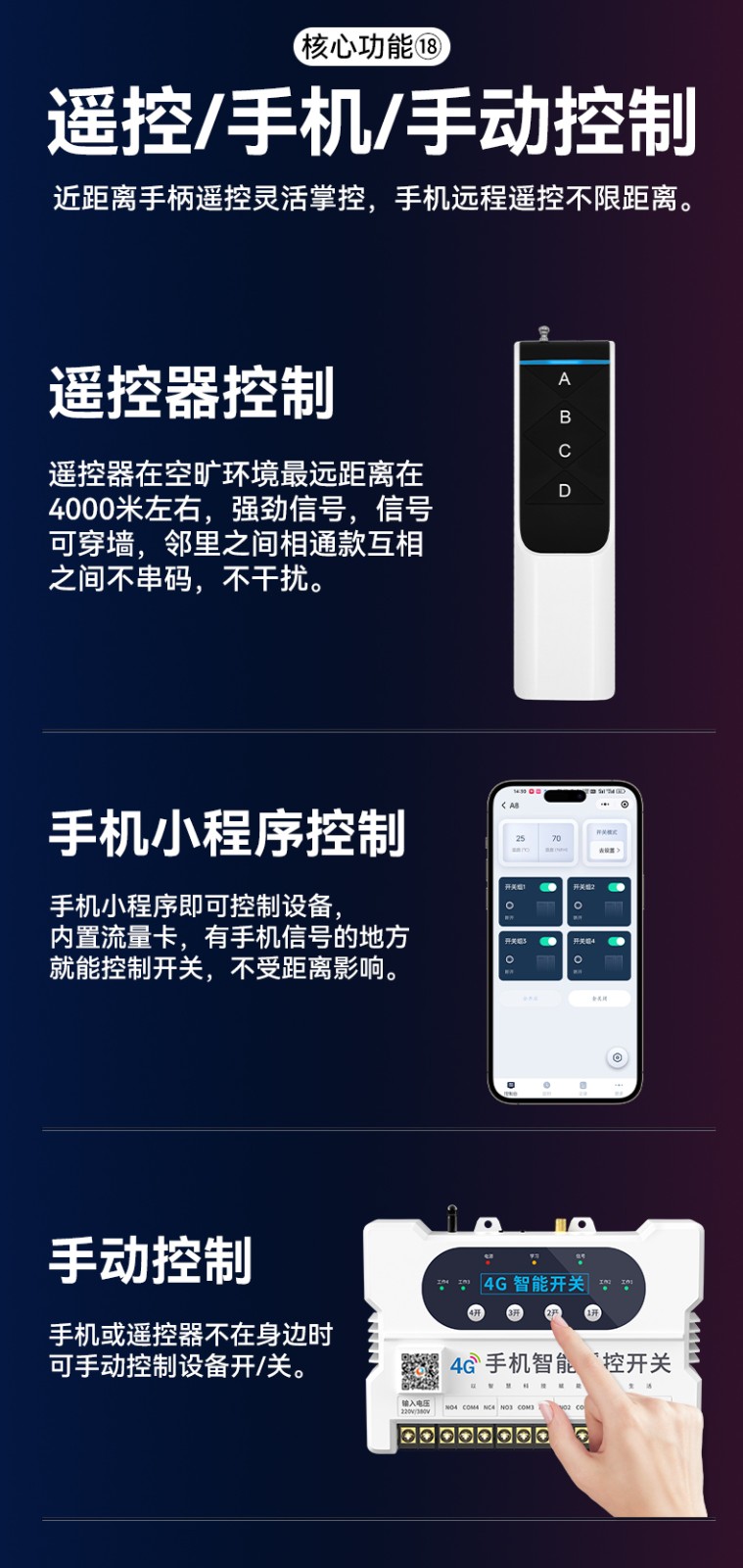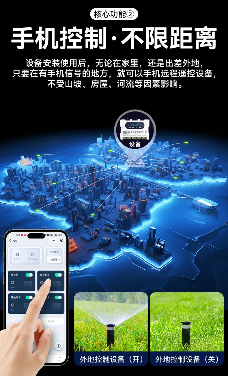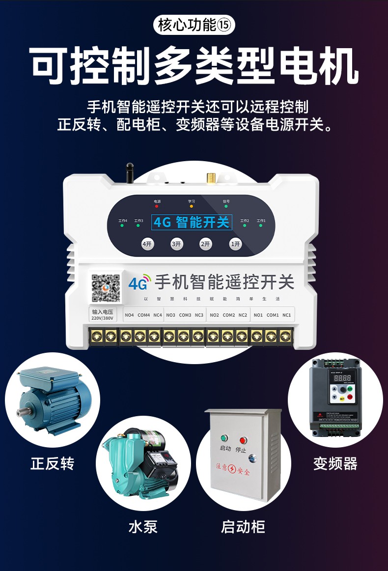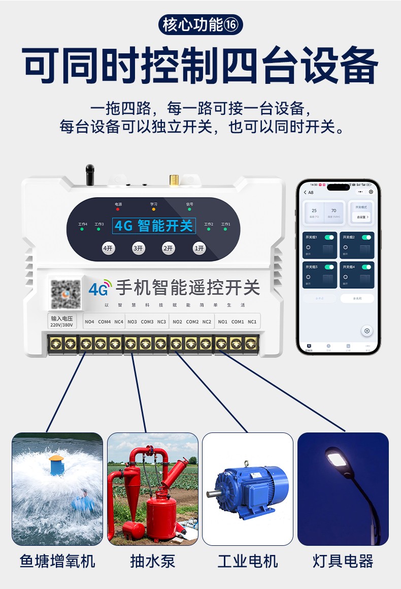 4G遠程控制開關(YS-A8) 產品規格 功能特點 資料下載 4G遠程控制開關(YS-A8)無需流量、無需插卡 、無需WIFI手機小程序控制定時開關:云端定時 、本地定時、 倒計時多人控制斷電提醒 +信息推送狀態檢測三種工作模式自動切換:點動模式 、互鎖模式 、自鎖模式工作電壓: 220v/380v (可選)應用場景:正反轉、水泵、啟動柜、變頻器 、魚塘增氧機、抽水泵、工業電機、燈具電器等