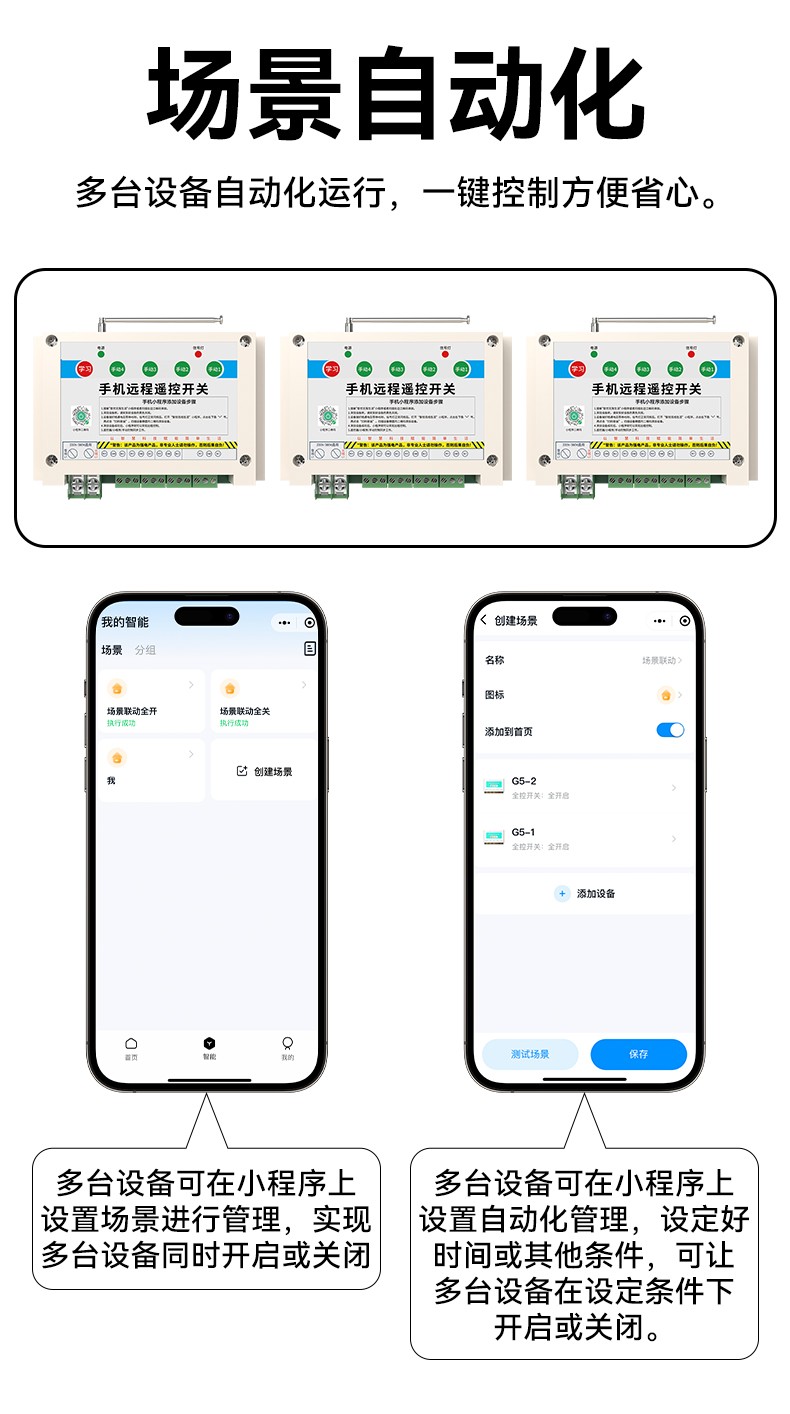控制方式:小程序控制 、  RF遙控器控制、 手動按鍵