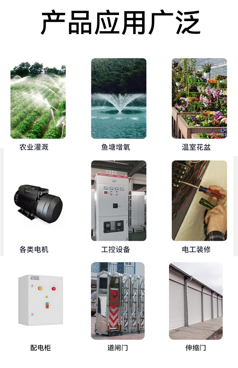 應用場景:水泵電機, 增氧機 ,家居電器燈具,農田灌溉,工廠機房設備